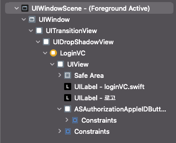 뷰는 동작 화면에서는 Storyboard로 구성한 화면만 보이지만, 실제로는 사진과 같은 구조로 많은 층으로 쌓여있다.