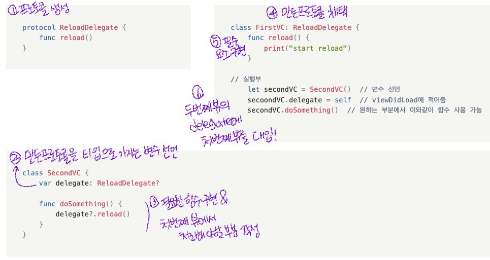 위 예제는 SecondVC의 클래스에서 doSomething 함수의 delegate?.reload() 가 실행되었을 때 FirstVC의 reload부분이 실행되는 예제이다.