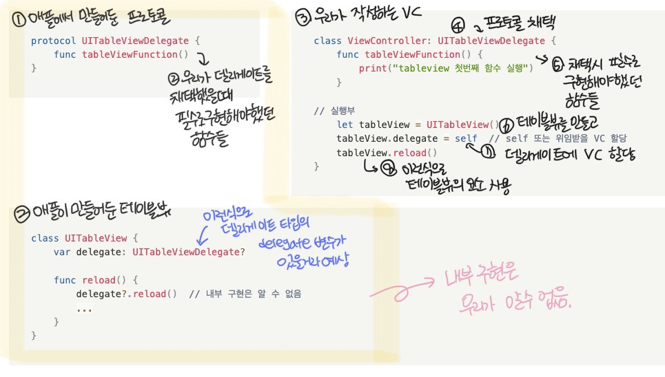 따라서 위 UITableView 클래스의 delegate에 할당한 나의 ViewController가 전달되어 우리가 함수를 사용하는 것이다.
